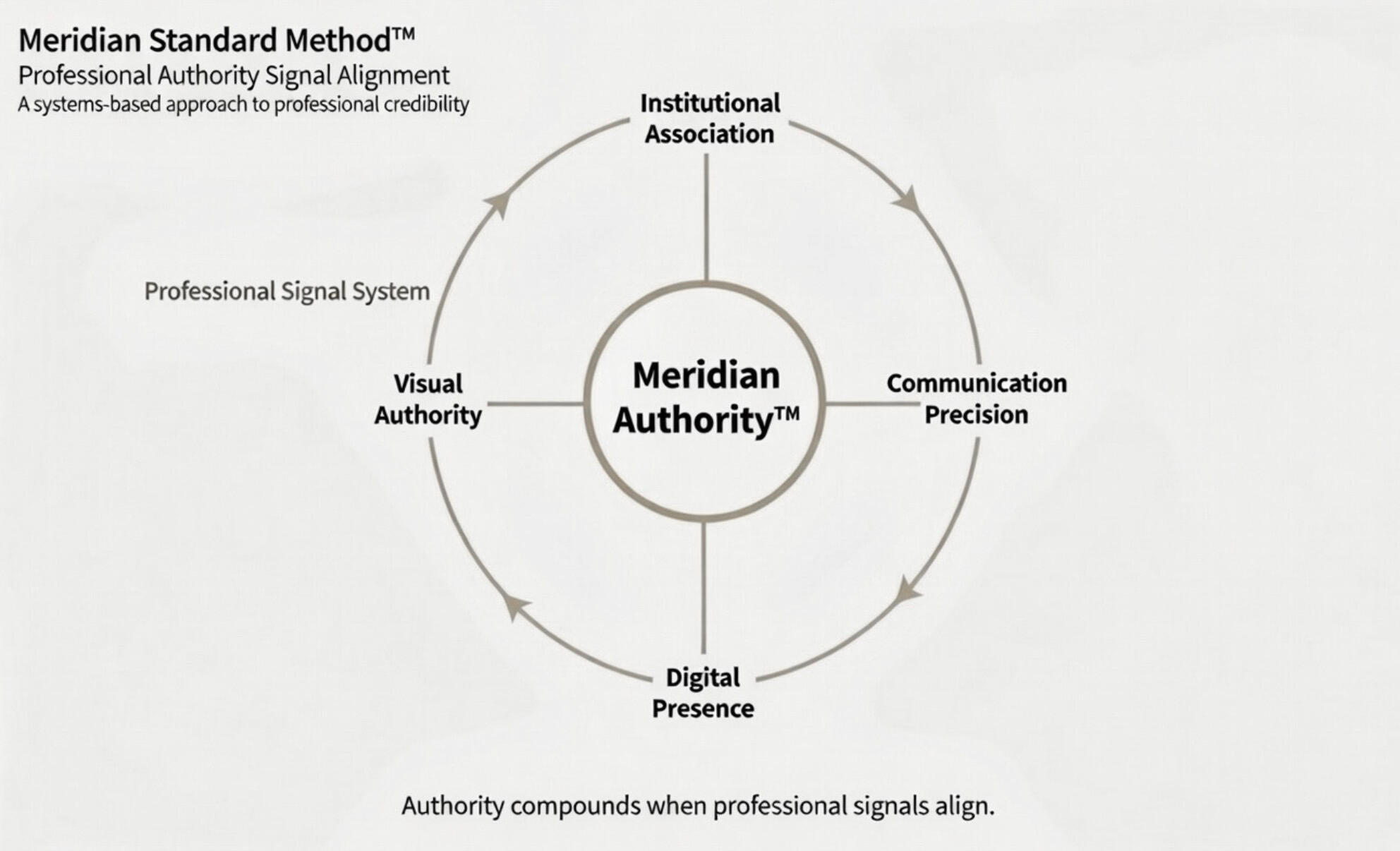 across every visible point of interaction.The Meridian Standard Method™ aligns the signals that determine professional authority across four Professional Signal Domains:• Institutional Association